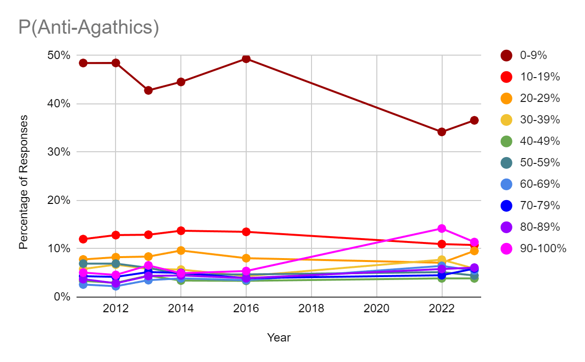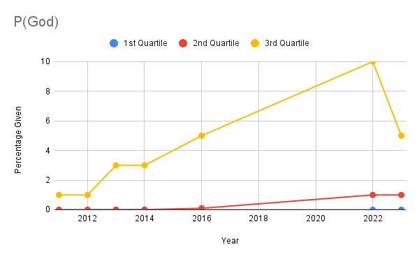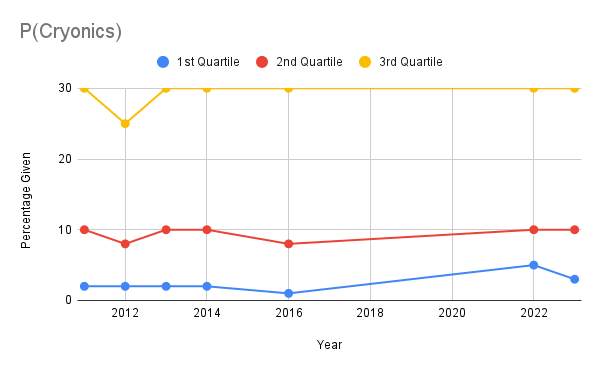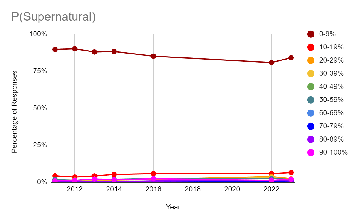 This is a question whose answer I want to keep an eye on over time. I don’t expect the next hundred years to give us any new insights into whether God exists, and I wouldn’t expect the next ten years to give us much in the way of new updates as to whether aliens exist, but if cryonics does work I’d expect a slow rise over time as the tech got better and better. Maybe that’s wrong though; if I imagine a similar survey of whether powered flight and airplanes would ever work that graph would have had a very sudden and unexpected spike in 1903.