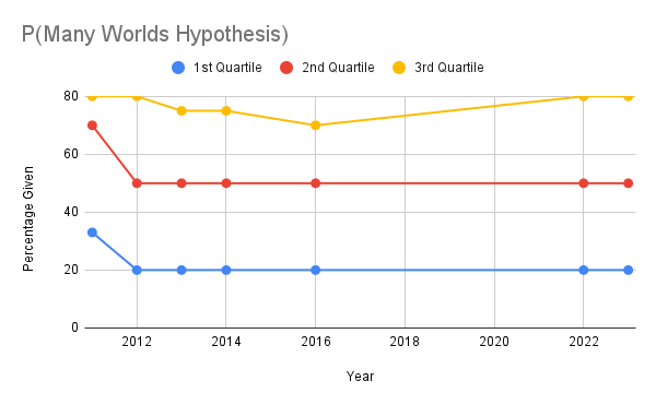 The other view I liked was this, where instead of buckets I used 1st, 2nd, and 3rd quartiles as lines. This makes it harder to spot where a one group had heavy agreement, but it is a lot less visually tangled (fewer lines, and they never cross) and it gives a sense of where there’s a wide spread and where there’s more agreement. Compare P(Many Worlds) (where anywhere from 20% to 80% was within the common range) to P(Supernatural) where there was a very heavy concentration under 5%.