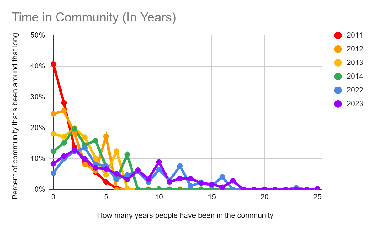 I spent a bunch of time trying to figure out the best way to look at this in chart form. (Doing it by count had too much noise from the number of respondents.) I also spent some time trying to clean the data up, since there’s several different formats this question has been asked in over the years that I don’t think change the responses, just how the computer parses them. (“How many months have you been in the community” vs “How many years have you been in the community” plus what I think was something like “In what year did you join the community?”)