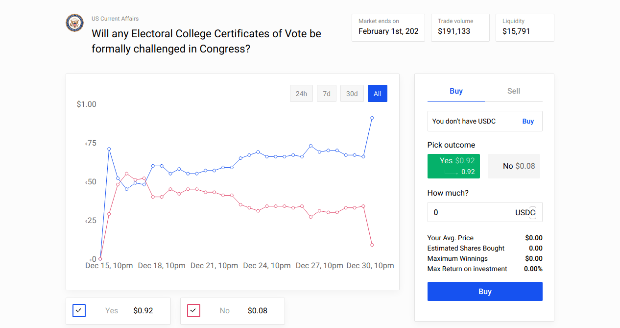 Other platforms that I haven't looked much into are catnip.exchange, Augur, and Omen. For some of these platforms, one needs to acquire USDC, a cryptocurrency pegged to the dollar. For this, I've been using crypto.com, but it's possible that Coinbase or other exchanges offer better rates. If you're interested in making a bet, you should do so before the 6th of January, one of the last checkpoints in the American election certification process. Note that getting your funds into a market might take a couple of days.