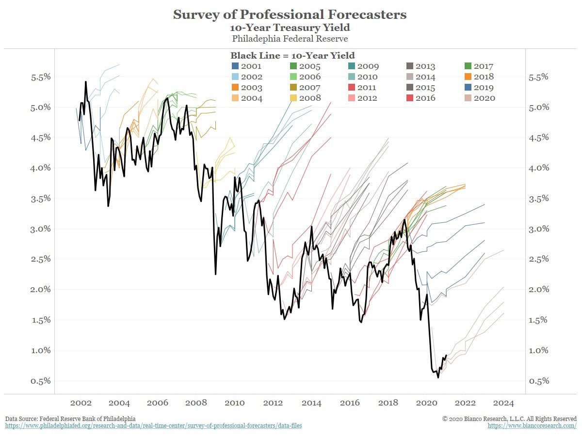 Twitter user @kjhealy visualizes forecasts from the Survey of Professional Forecasters: