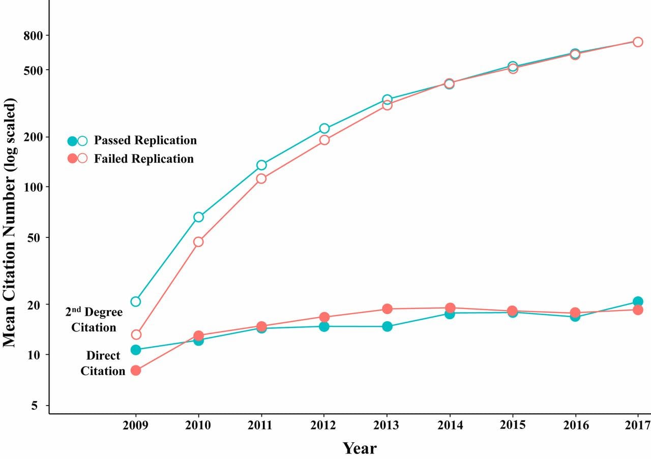 A nice tidbit from the paper is that past citation count isn’t very predictive of future replication: