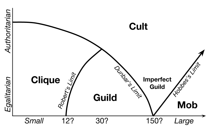 I'm more confused about the Dunbar number curving, even in fairly authoritarian systems you should still be able to know and maintain personal relationships with other members of the group. There's also the implication that a Guild could be a reasonable format for 50-100 people if mostly egalitarian, but hits size limits as the leader takes on more authority, which seems the opposite of what I'd expect.