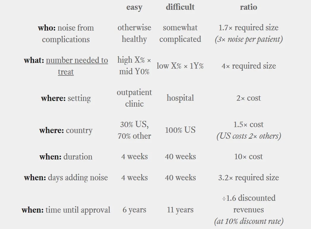 New drugs in development can be “easy” drugs or “difficult” drugs. (You can think of the factors in terms of who / what / where / when / why / how.) The latter can require literally one hundred times more investment than the former. Easy drugs can be made difficult -- no one will stop you -- though the most lucrative blockbuster drugs will have require many-to-most of the difficult factors. As a direct consequence, players up and down the stack are far more used to developing difficult drugs than easy ones. Clinical campaigns that could be fast and cost-effective will slide towards being slow, expensive, and bloated by default.