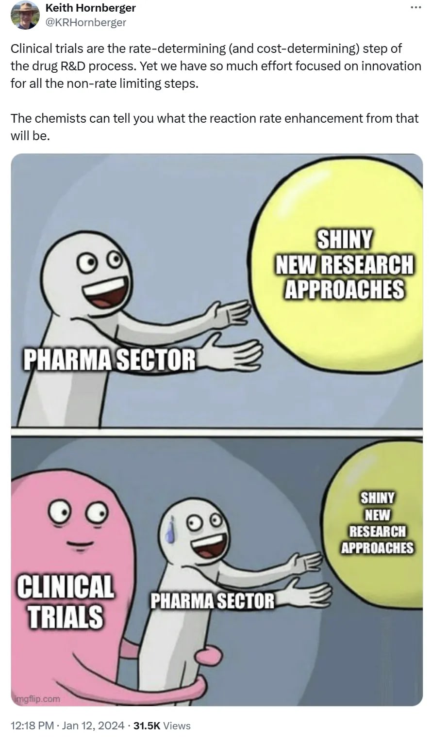 Drug discovery is critically important and has promising opportunities that are being unlocked by AI, but it isn't the rate-limiting step in the process of bringing new drugs into the world. Opening new floodgates in drug discovery with [your technology here, possibly including "AI"] won't move the needle on new drug approvals if we don't also fix clinical trials.