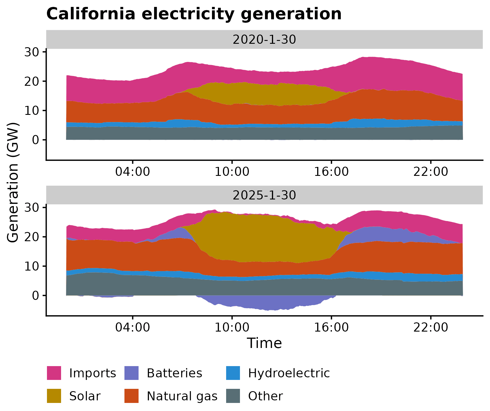 You can see two local maxima of natural gas generation in 2020, in the early morning and early evening hours when people are awake but the sun isn't shining. On the same date in 2025 and at the same times, we see peaks of batteries discharging. (I assume negative generation from batteries corresponds to batteries charging.)