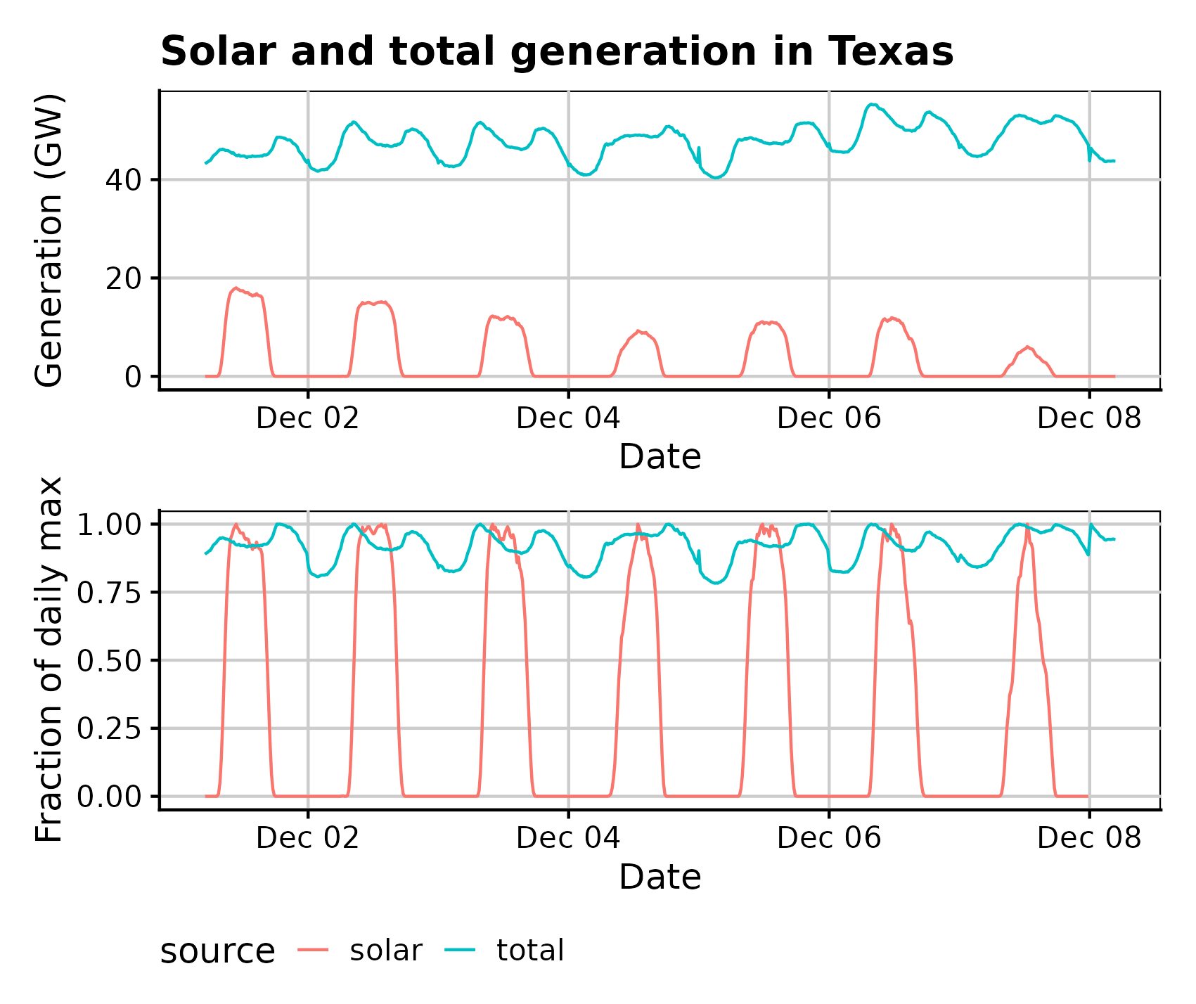 In the bottom plot, I normalized to the max of each peak for that day, so you could see the mismatch better. This is in December, when the days are short, so you should consider it extreme, not typical. The mismatch between these peaks raises an awkward question for a solar-heavy grid: how to "adjust" the generation peak to match the demand peak?