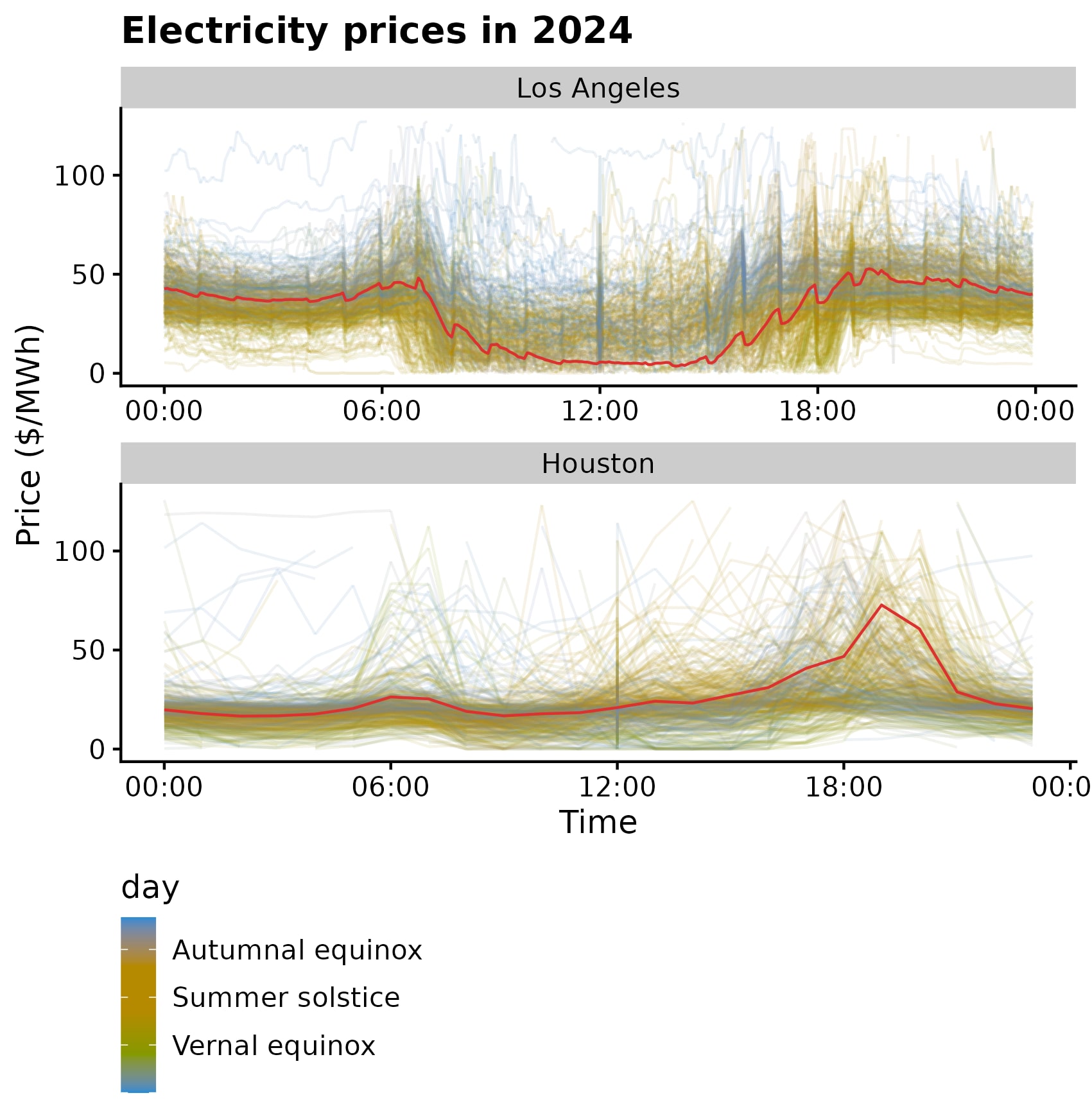 We can understand the economics of peak adjustment better, though, if we take the perspective of a Megapack owner. If we can make money by buying a Megapack, charging it with solar at noon, and discharging it in the early evening, what stops us from making money by buying a Megapack and discharging it at midnight? The answer is that in a solar heavy grid, electricity prices tend to be higher during that peak mismatch. I've retrieved prices from energyonline.com and plotted them throughout 2024, in Los Angeles and Houston, showing each day's prices with a transparent curve and the average with a solid red curve: