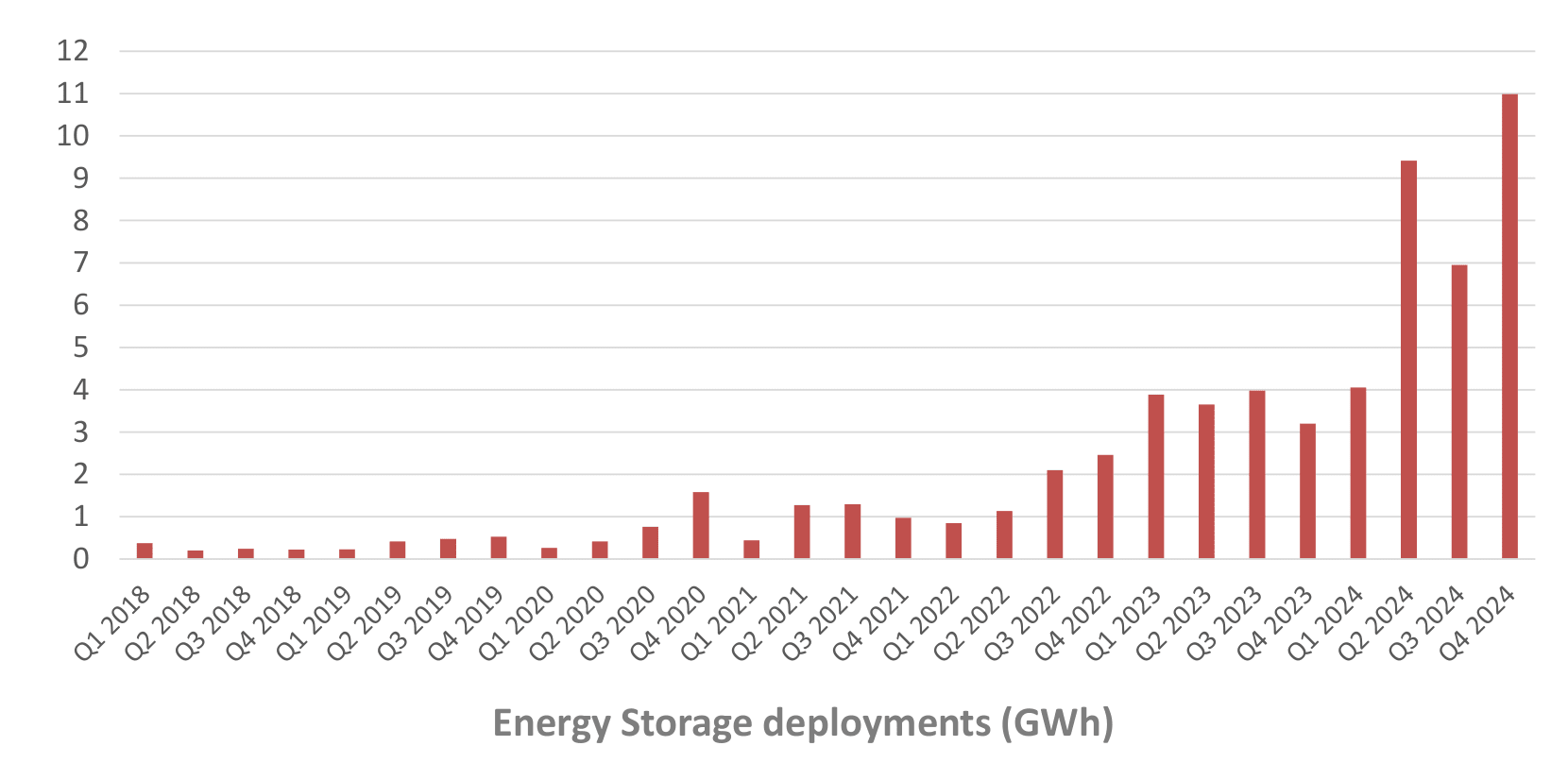 The sunlight hitting even a small portion of the United States has enough energy to power the whole country—that simple calculation was the subject of the last post. All this shows on its own is that running the country on solar power is physically possible. With photovoltaics it may be not just possible but practical, but photovoltaics on their own left open the question of what to do at night. Now it seems that the answer may be battery energy storage. Here's Tesla's sales of battery energy storage systems again, but updated since my last post to include 2024 Q4: