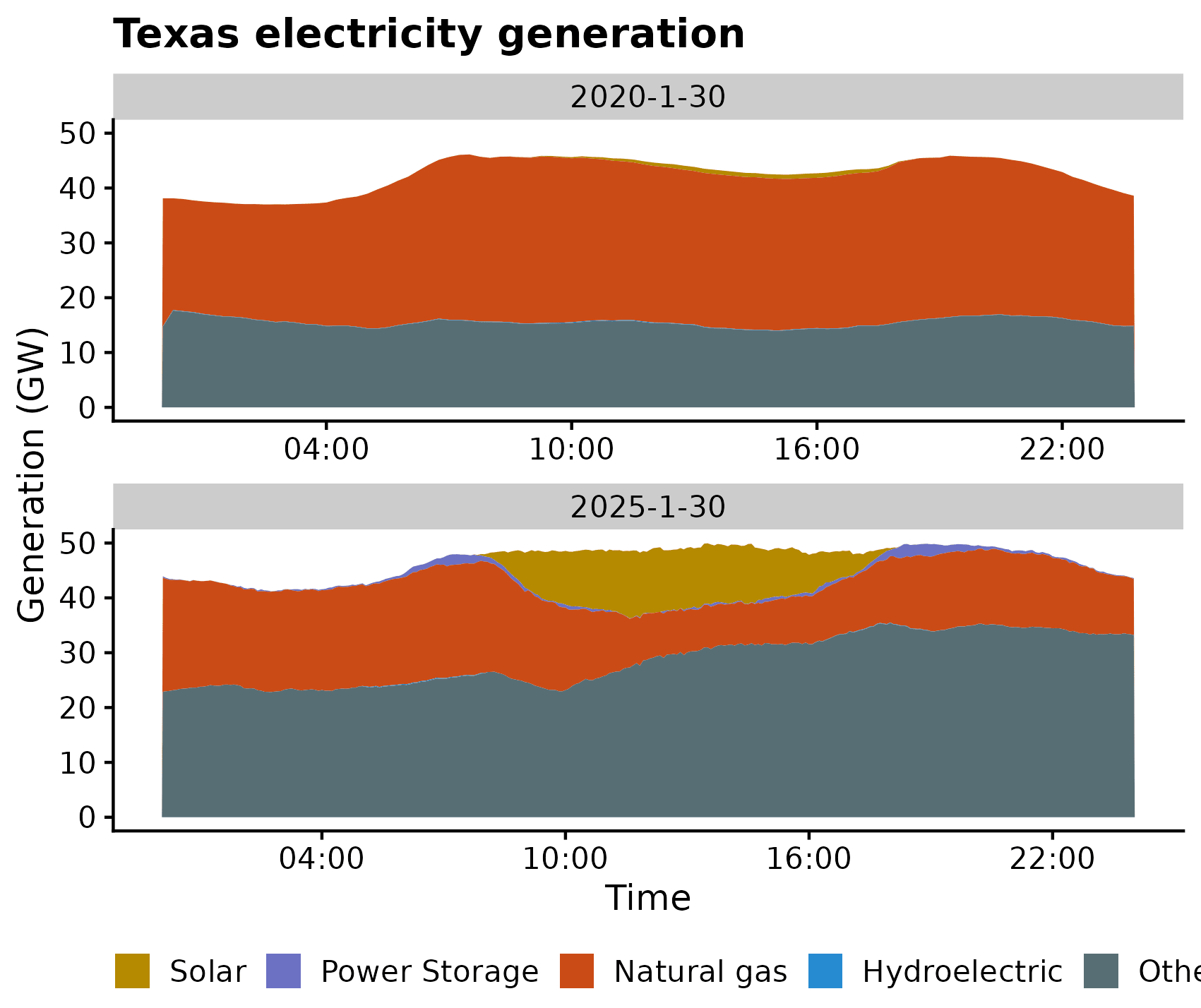 I assume "power storage" is almost entirely batteries, and I suppose this data doesn't include charging as negative values. We only really see peak adjustment of any kind recently, since Texas didn't have much solar until recently. But in Texas the use of natural gas to adjust the solar peak is much more clear than in California, which seems to rely as much on imports as flexible gas generation.