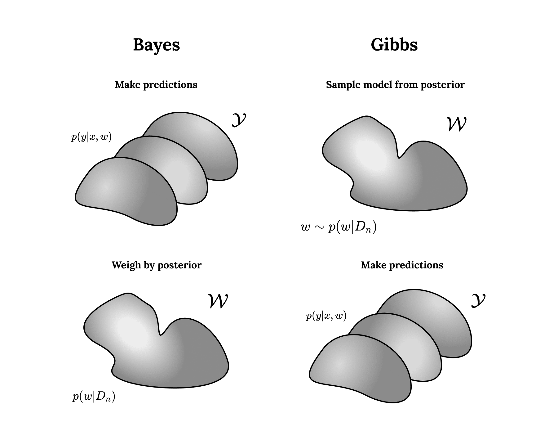 In practice, evaluating these kinds of integrals is intractable. A more tractable alternative is Gibbs estimation, where we draw a particular choice of weights and make predictions using the corresponding model . This procedure is closer to the kind of paradigm we're in with neural networks: the model we train is a single draw from the distribution of final weights over different initializations and learning schedules.