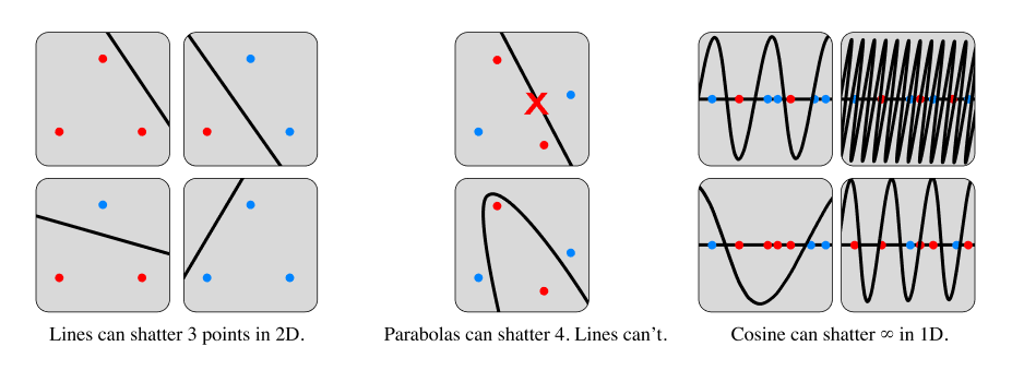 So a straight line can shatter a set of three non-collinear points on a 2D, but not four. A parabola can shatter four points but not five. And so on.