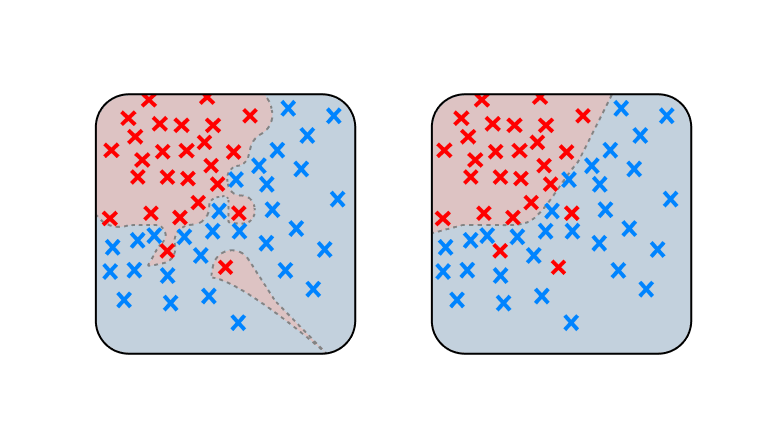 The more fundamental problem is that the assumption that "large margins = better generalization" doesn't hold for realistic models. Which of the following two decision boundaries would you say generalizes better?