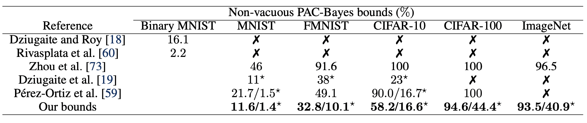 Zhou et al. (2019) combine this idea with the idea of data-dependent priors that shows up in PAC-Bayes theory. The posterior is chosen to be a Gaussian centered at the learned weights and the prior is chosen to be the set of compressed weights (obtained by pruning). Similar to the approach taken by Dziugaite and Roy (2017), they add in a dash of minimum sharpness by overlaying Gaussian noise over the non-zero weights. The resulting bounds are among the first to be non-vacuous for neural networks, but they're still far from tight.