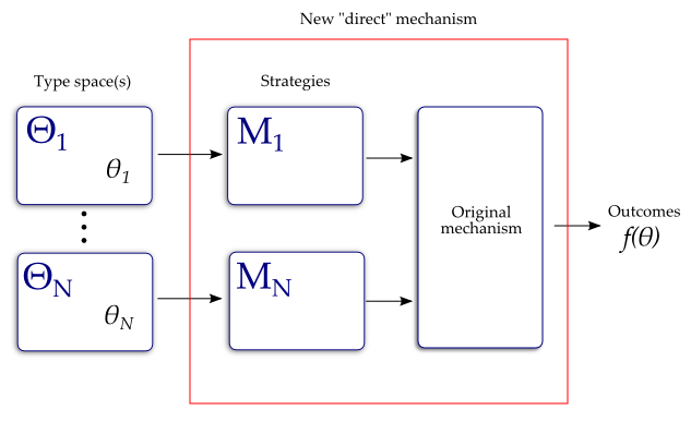 But wait! Since we expect a type θi agent to send message mi(θi), why don’t we just package that inside the mechanism? Each agent will tell us their type and the mechanism designer will play in proxy for the agent according to the original mechanism. We’ll call this the direct mechanism for f since all we need to know is that agents tell us their types and then are assigned outcome f(θ), no matter what we’ve blackboxed in the middle.