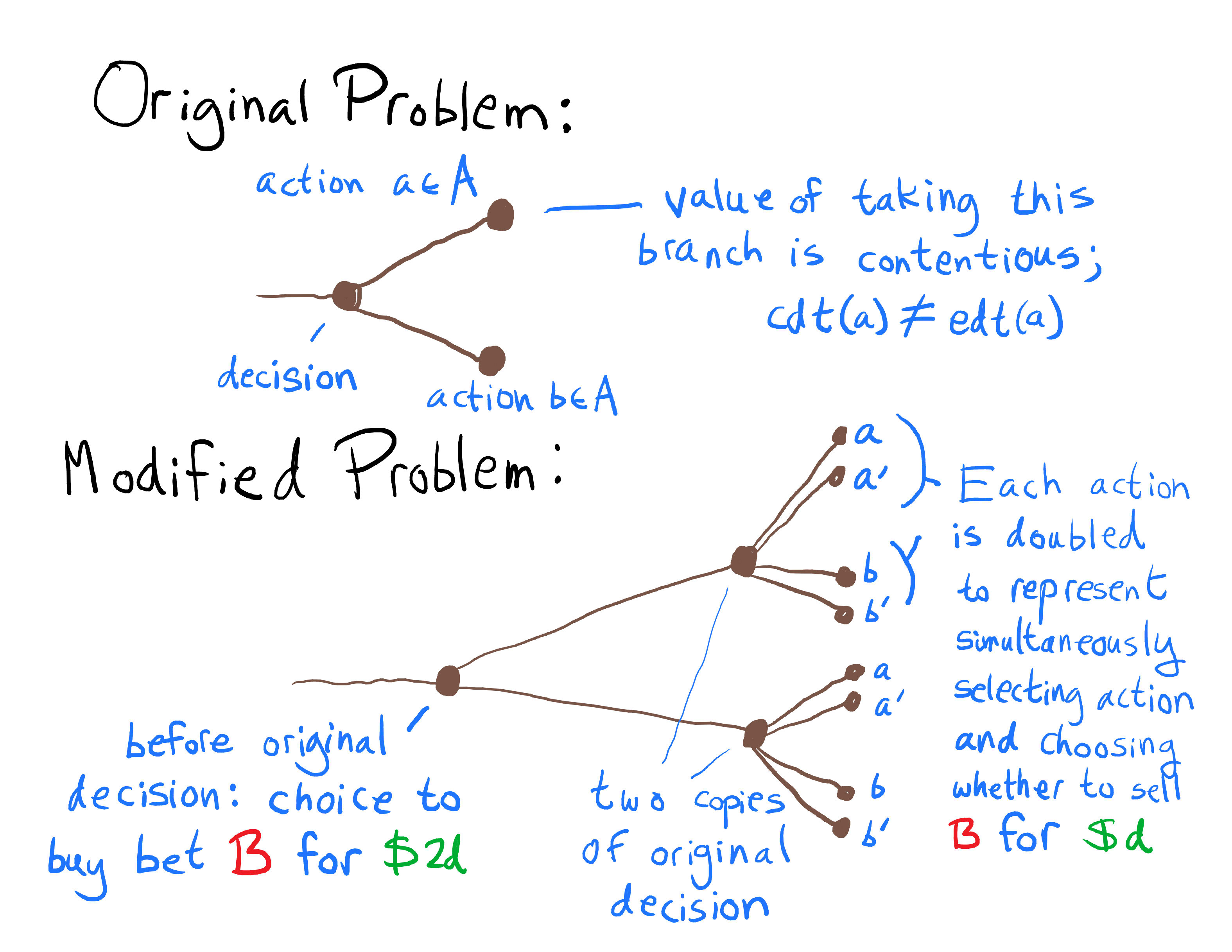Anyway, as I was saying, we wish to take the decision problem which produces the disagreement between edt(a) and cdt(a), and from it, produce a new decision problem which is a Dutch book.