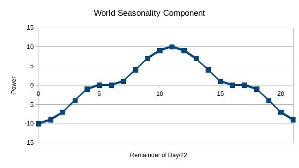 Earth and Ocean combine to create the World. World Mana can be decomposed into an average (68), some random noise (1d4 - 1d4), and a seasonality effect.