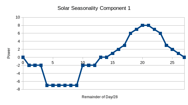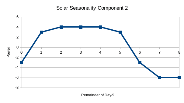 Solar is the strongest and most complicated mana type. It can be decomposed into an average (40), a small amount of random noise (+ 1d2 - 1d2), two seasonality components, and the effects of distant supernovae.