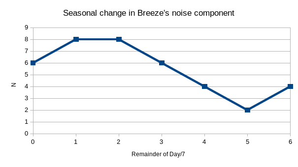 The breeze varies, as does its variance. It is composed of an average (13), and some random noise which varies seasonally (1dN - 1dN, where N is given in the graph below).