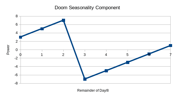 Doom builds gradually, then diminishes sharply as it is fulfilled. On a typical day, it can be decomposed into a starting point (24), some random noise (1d6), and a jagged seasonality effect.
