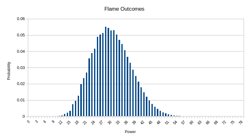 Flame catches, sputters and starts, building and waning randomly. Today’s Flame mana is yesterday’s, minus 25% (rounded down), plus the lowest of two d20 rolls.