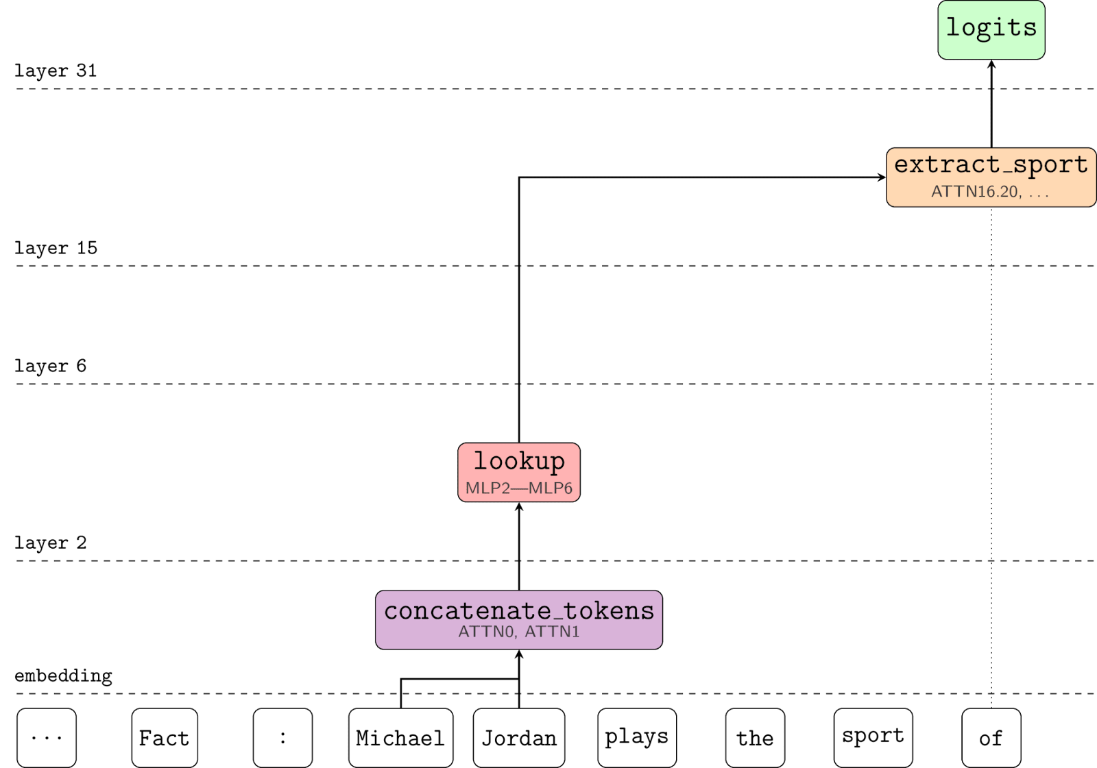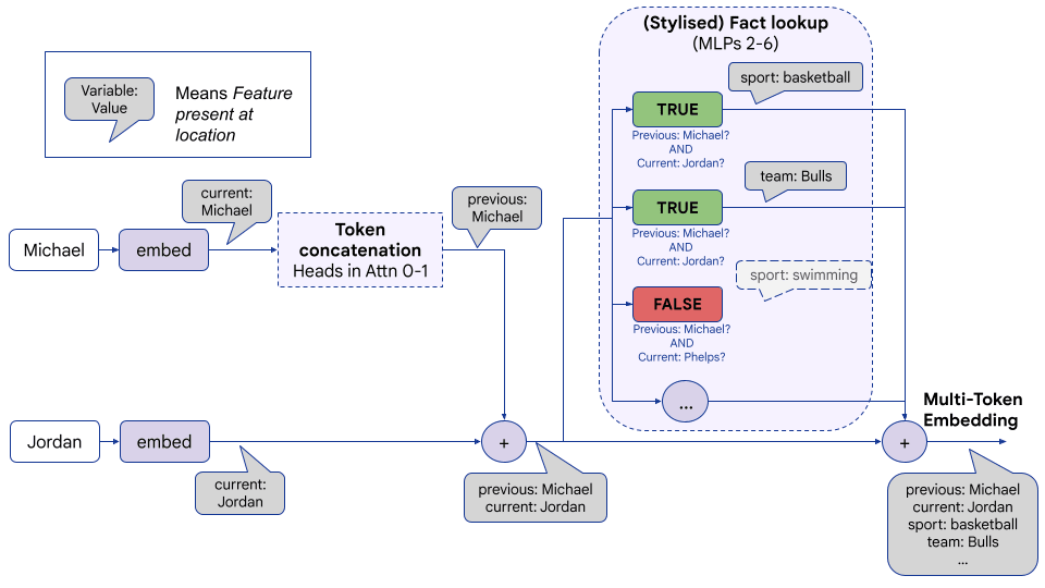 We think that early attention layers perform token concatenation by assembling the raw tokens of these entities on the final token (the “ Jordan” position). And early MLP layers perform fact lookup, a Boolean AND (aka detokenization) on the raw tokens to output this multi-token embedding with information about the described entity.[13] Notably, we believe this lookup is implemented by several MLP layers, and was not localisable to specific neurons or even a single layer.