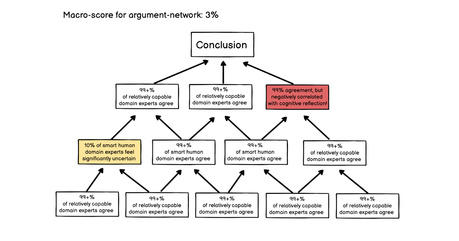Also: With argument-networks the hope would be that every “piece” of the argument might be quite crisp and quite solid. If we make an analogy to a house, then basically we would prefer all of the building to be built by sturdy material. There should preferably be no “pieces” that are kind of like “well, on one side [x], but on the other side, [y]”.