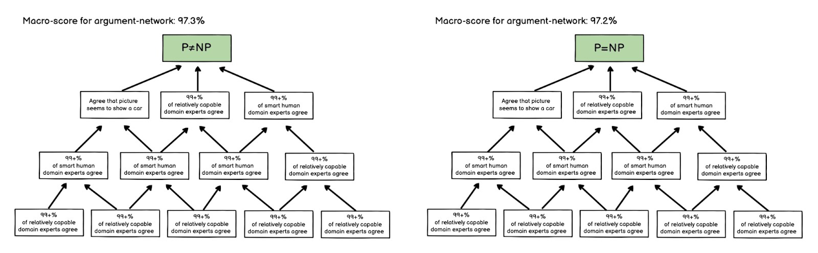 And it is intentional that I said that an argument-tree arguing that “P=NP” might have one or more nodes where “P=NP” is the conclusion. I say this, because a node would center around things that humans evaluate. But conclusions may also be drawn based on computational/automatic procedures that human-evalautable nodes conclude to be valid.