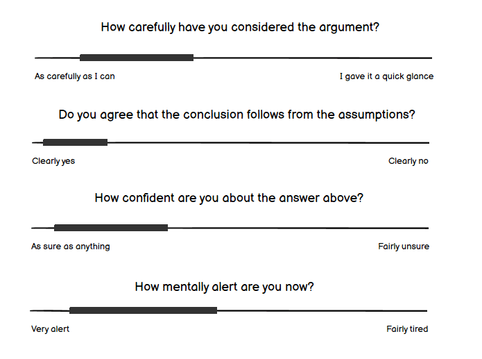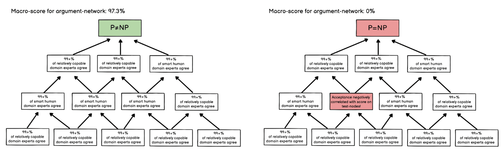 Even if humans evaluating “argument-nodes” knew the topic of discussion, they should not be expected to keep the totality of arguments that have been presented in their heads. For example, if an argument-network was used to argue “P=NP”, humans evaluating nodes in this argument-network would not be asked to give their opinion on “P=NP”. One or more nodes in such a network might have “P=NP” as a conclusion, but when evaluating such a node, what the human would be evaluating would be if “P=NP” followed from the conclusion.