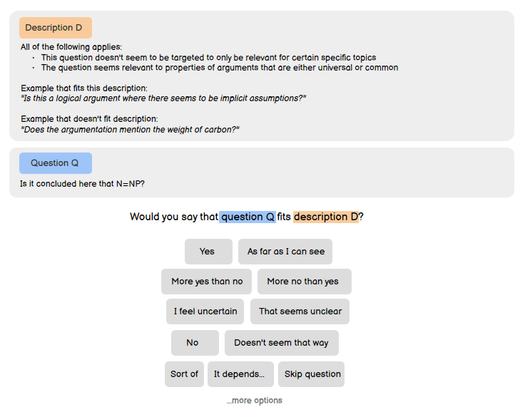 In the example above, the human is reviewing one step of logical inference, and asked if this step of inference is in accordance with a given inference-rule. This would be one possible approach for having humans review logical inference, but not the only one.