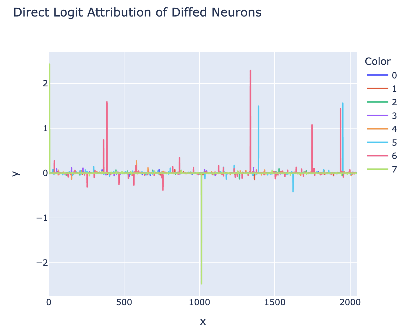 I then just tried looking at the difference in direct logit attribution (to C0) between clean and corrupted for every neuron. This looked way more promising - most neurons were irrelevant, but a few mattered a ton. This suggested I could mostly ignore everything except the neurons that mattered. This gave me, like, 10 neurons to understand, which was massive progress! Bizarrely, MLP7 had two neurons, which both mattered a ton, but near exactly cancelled out (+2.43 v -2.47).