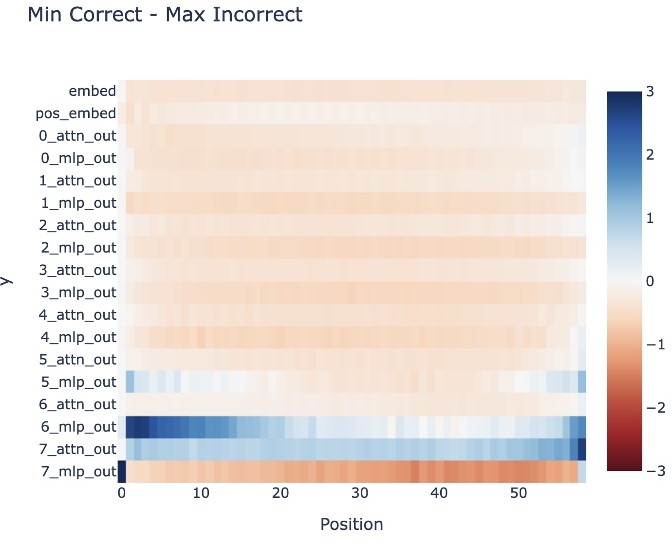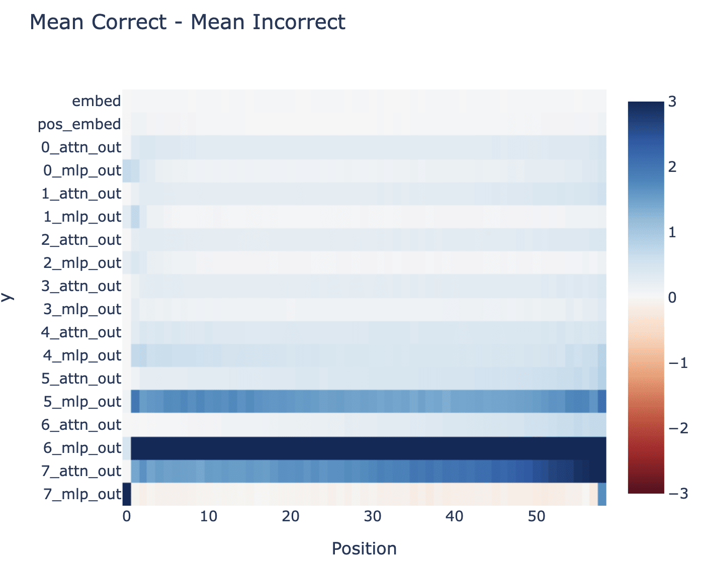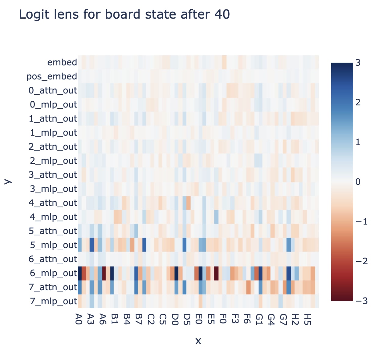 Being more systematic supported this. This is a bit of a weird problem, because there are many (and a variable number of!) valid next moves, rather than a single correct next token, so I tried to both look at the difference in average direct logit attribution for the correct/incorrect next logit, and the difference in min/max contribution. The former doesn't capture bits that disambiguate between borderline correct and borderline incorrect moves, since most moves will be obviously bad, and the latter is misleading because you're taking the max and min over large-ish sets, which is always sketchy (eg it gives misleading results for random noise) - you get a weird spectrum from early to late moves because there are more options in the middle. I also saw that layer 7 acts very differently at the first and last move, presumably because those are easier special cases, but decided this was out of scope and to ignore it for now. I tried breaking the attention layers down into separate heads, but didn't have much luck.
