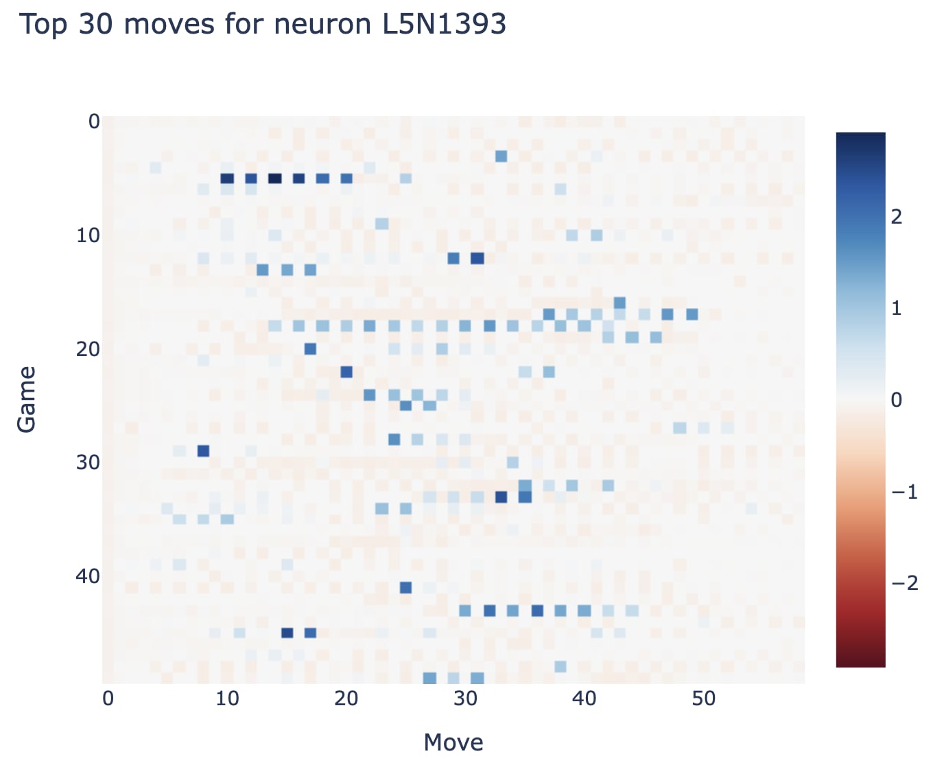 The next easiest place to start was max activating dataset examples - I initially felt an impulse to run the model across tens of thousands of games to collect the actual top dataset examples, but I realised this would be a headache and probably unnecessary. I had run the model for 50 games (thus 3000 moves) and decided to just inspect the neuron on the top 30 (1%) of games there.