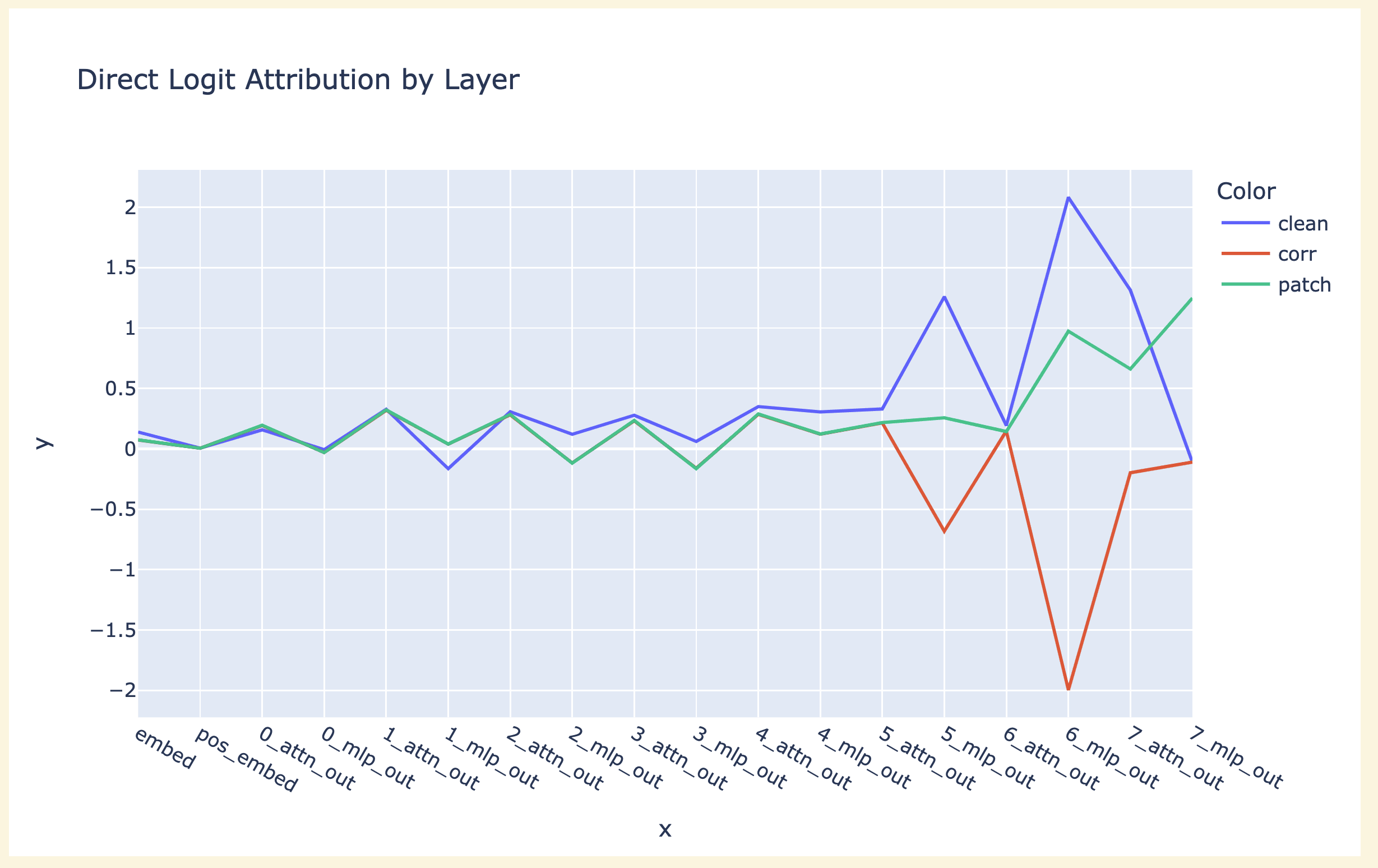 To start with, I cached all activations on the run with a corrupted input but a clean neuron L5N1393, and started comparing the three. The obvious place to start was direct logit attribution of layers - MLP7 went from not mattering in either clean or corrupted to being significant?!