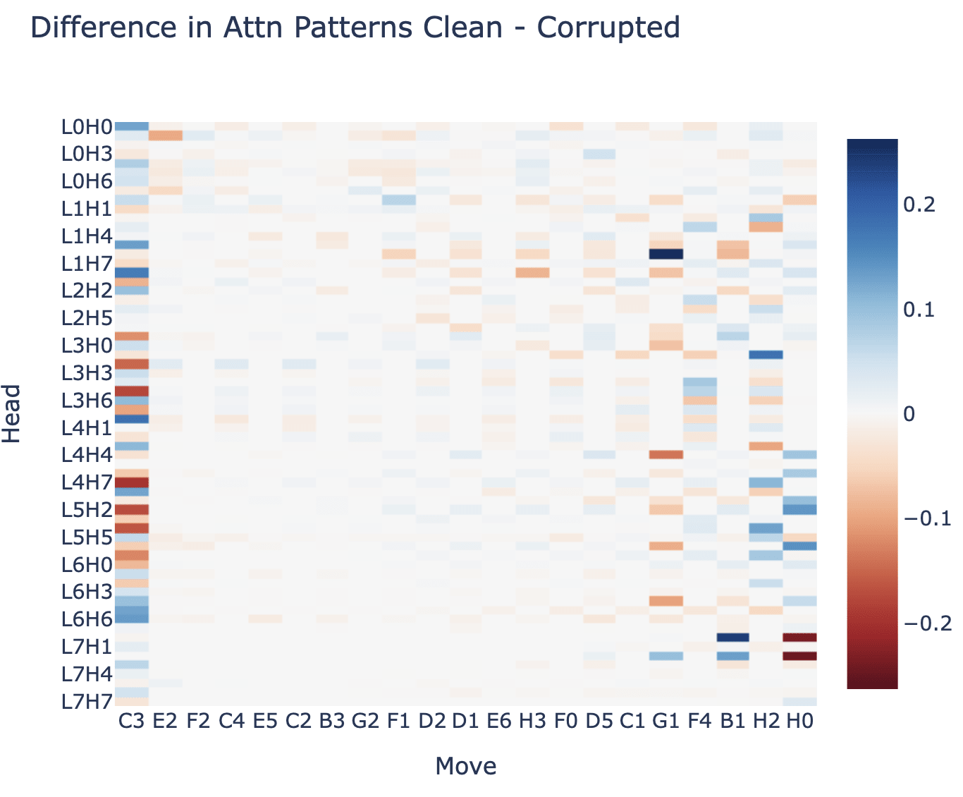 I gave up on this idea because it seemed too hard, and instead decided to be decisive and do the dumb thing of changing just the most recent move! I picked an arbitrary game, took the first 30 moves, and changed the final move from H0 to G0 to get a corrupted input. This changed cell C0 (I index my columns at zero not one, sorry) from legal to illegal. This meant I could take the C0 logit as my patching metric - it's high on clean, low on corrupted, and so it can tell me how much my patched activation tracks "the way that the most recent move being G0 rather than H0 is used to determine that C0 is illegal" (or vice versa). This is a very niche thing to study, but it's a start! And the virtue of narrowness says to favour deep understanding of something specific, over aiming for a broad understanding but not knowing where to start.