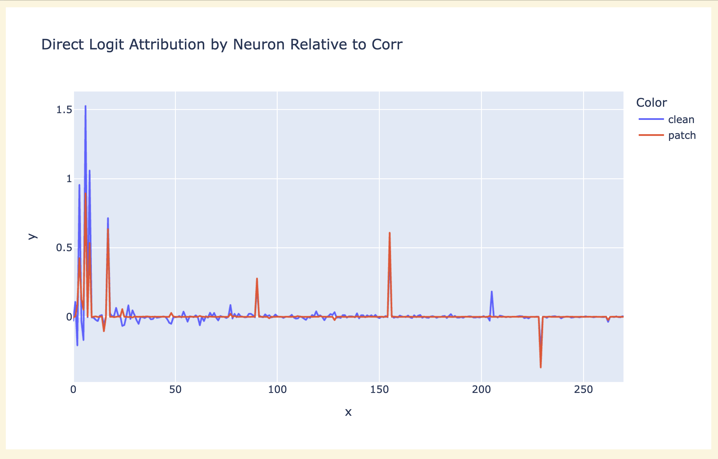 Digging into the MLP7 neurons and their direct logit attribution, I found that both clean and corrupted had a single, dominant, extremely negative neuron. But in the patched run, both were significantly suppressed. My guess was that this was some dropout solving circuit firing, and thus that MLP7 was mostly to deal with dropout - I subjectively decided this didn't seem that interesting and moved on. Interestingly, this is similar to how negative name movers in the Indirect Object Identification circuit act as backups - they significantly suppress the model's ability to do the task, but if you ablate the positive name movers they'll significantly reduce their negative effect to help compensate. (There it's likely a response to attention dropout)