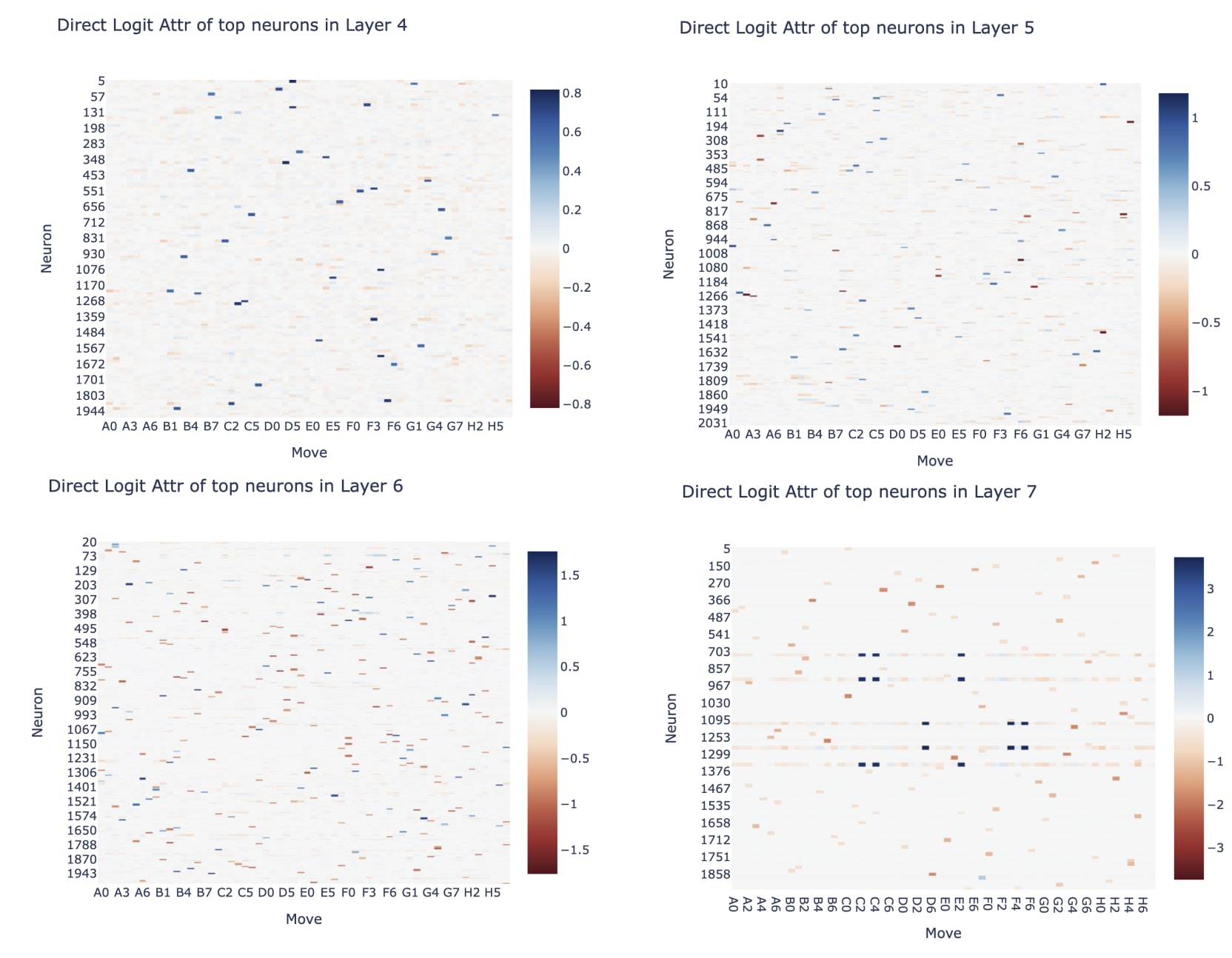 I then tried looking at the direct logit attribution of the top neurons in each layer (top = mean > 0.2, chosen pretty arbitrarily), and they seemed super interpretable - it was visually extremely sparse, and it looked like many neurons connected to a single output logit. Layer 7 had some weird neurons that seemed specialised to the first move. Aside: I highly recommend plotting heatmaps like this with 0 as white - makes it much easier to read positive and negative things visually (this is the plotly color scheme RdBu, px.imshow(tensor, color_continuous_scale='RdBu', color_continuous_midpoint=0.0) works to get these graphs)