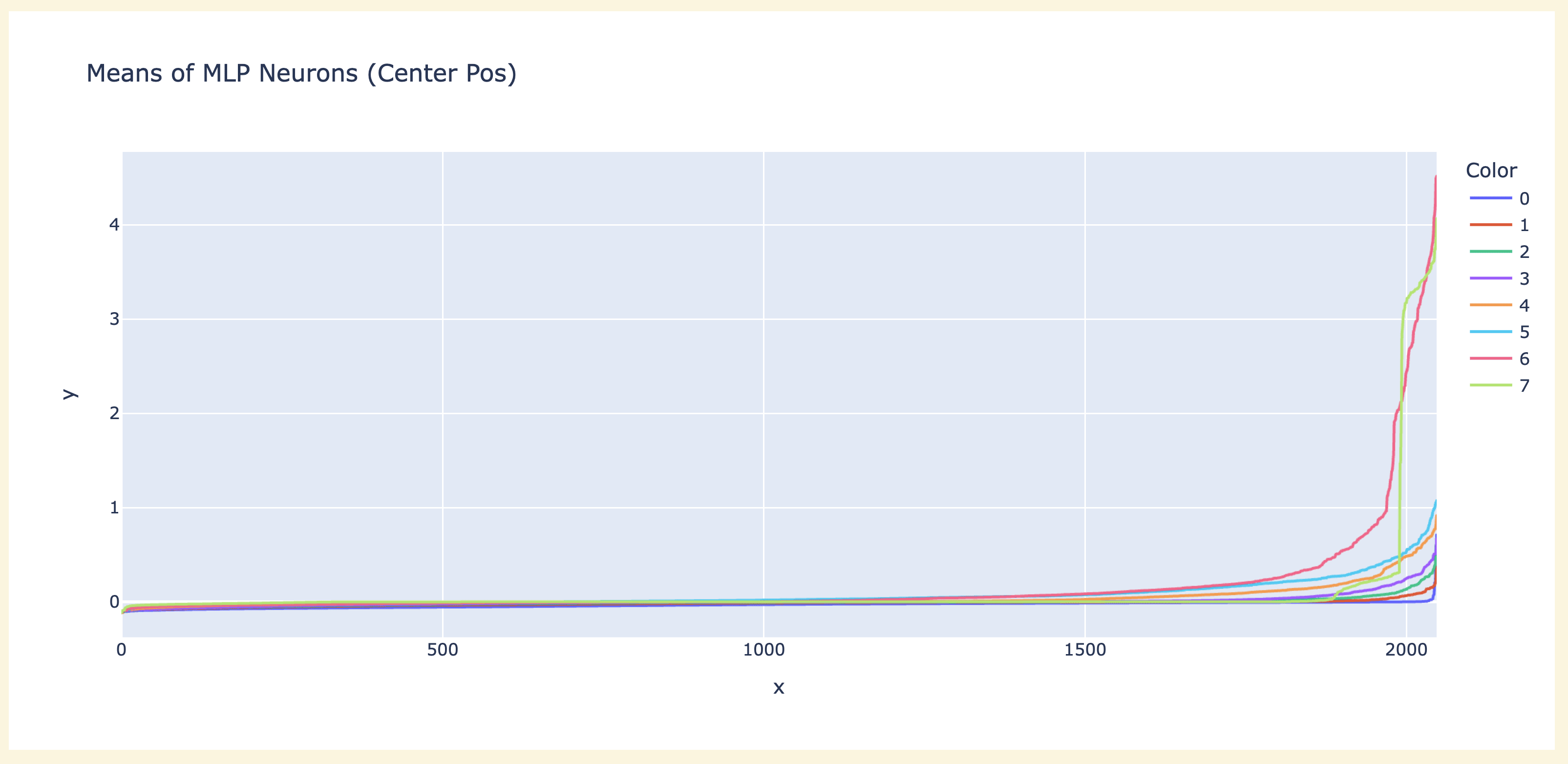 Finding that there were clean and interpretable neurons was exciting, and I got pretty side tracked looking at neurons in general - no particular goal, just trying to gain surface area and figure out what was up. Looking at the neuron means across 100 games on the middle moves ([5:-5]) showed that there were some major outliers, and that layer 6 and 7 were the biggest by far. (The graph is sorted, because it's really hard to read graphs with 2000 points on the x axis with no meaningful ordering!)
