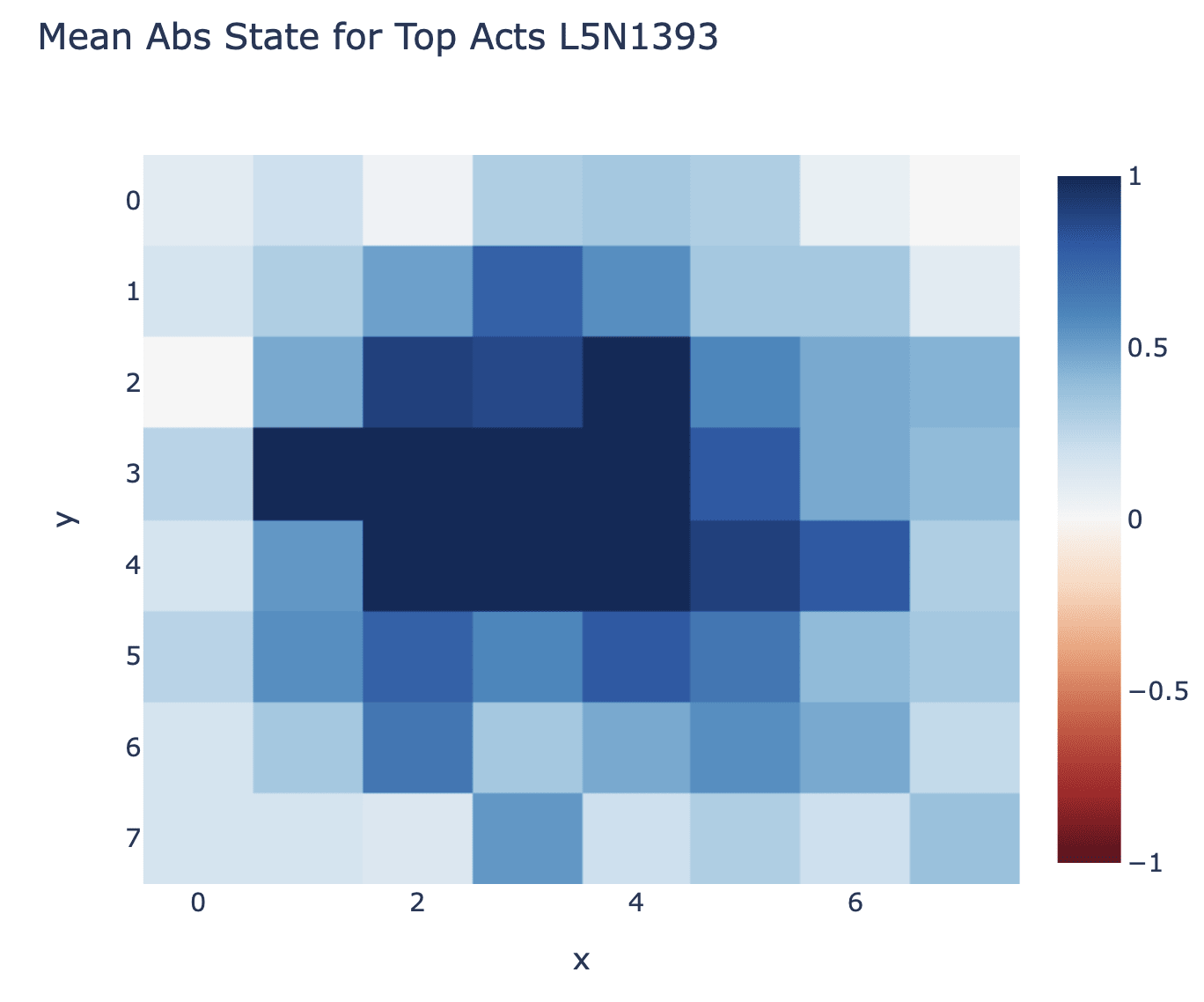 But now I had the flipped board state, it was pretty clear that this was the right way to interpret the neuron - it was literally 1 in D1 and -1 in E2 (here 1 meant "their's", because I hadn't realised I'd need a good convention). I looked at the max activating dataset examples for a few other neurons (taking the top 10 by norm in each layer) and saw a few others that were clean in the flipped state but not in the normal state, and this was enough to generate the idea that the relevant colour was "next" vs "previous" player (I only realised after the fact that "my" vs "their" colour was a cleaner interpretation, thanks to Chris Olah for this!)