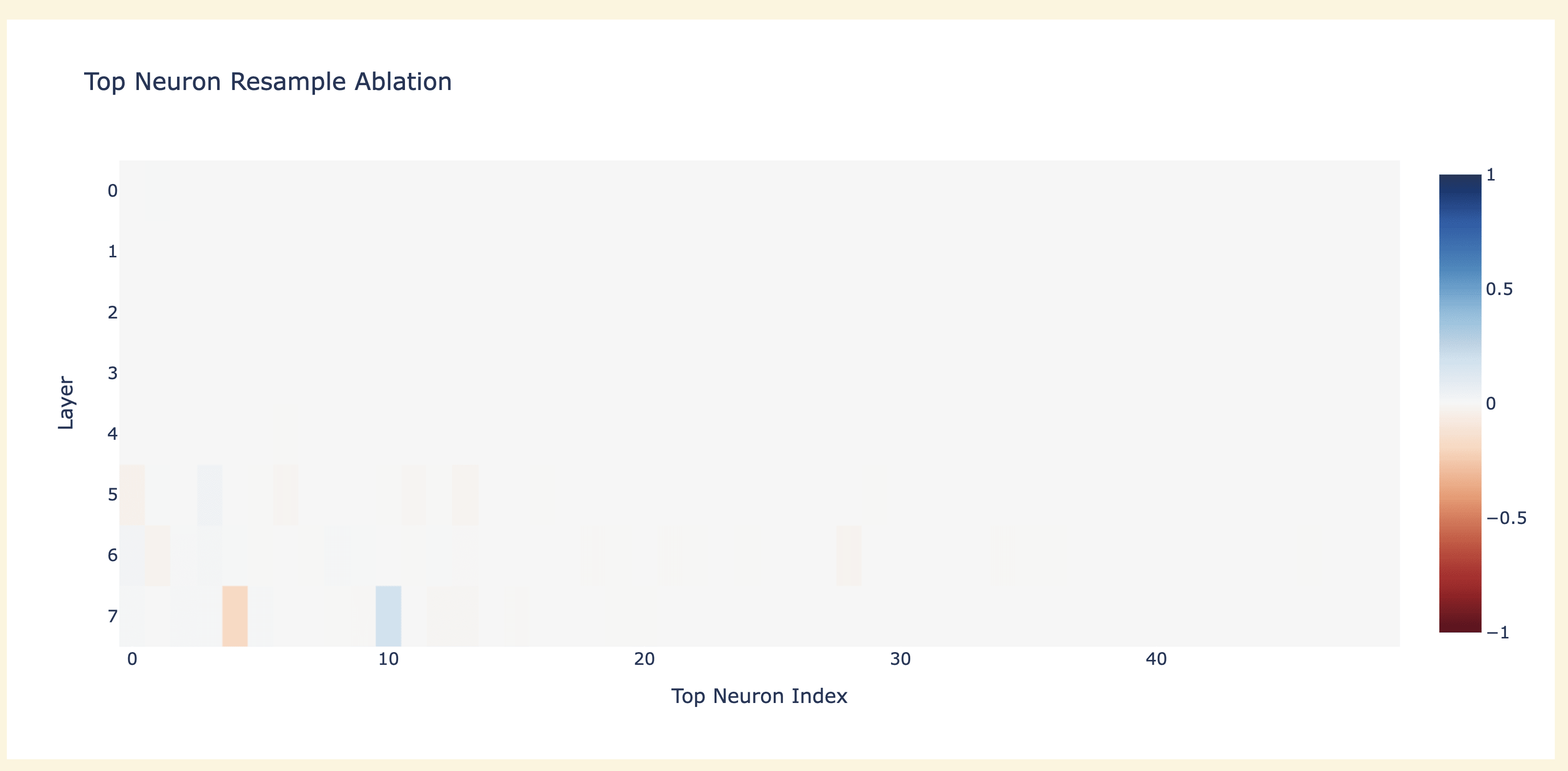 I then tried patching in individual neurons - doing all 16000 would be too slow, so I just took the neurons with highest activation difference and patched in those - activation difference had some big outliers. I first tried resample ablating (replacing a clean neuron with corrupted and seeing what breaks) and found that none were necessary (this isn't super surprising - neurons are small, and dropout incentivises redundancy), though the layer 7 neurons matter a bit (they directly affect the logits, so this makes sense!)