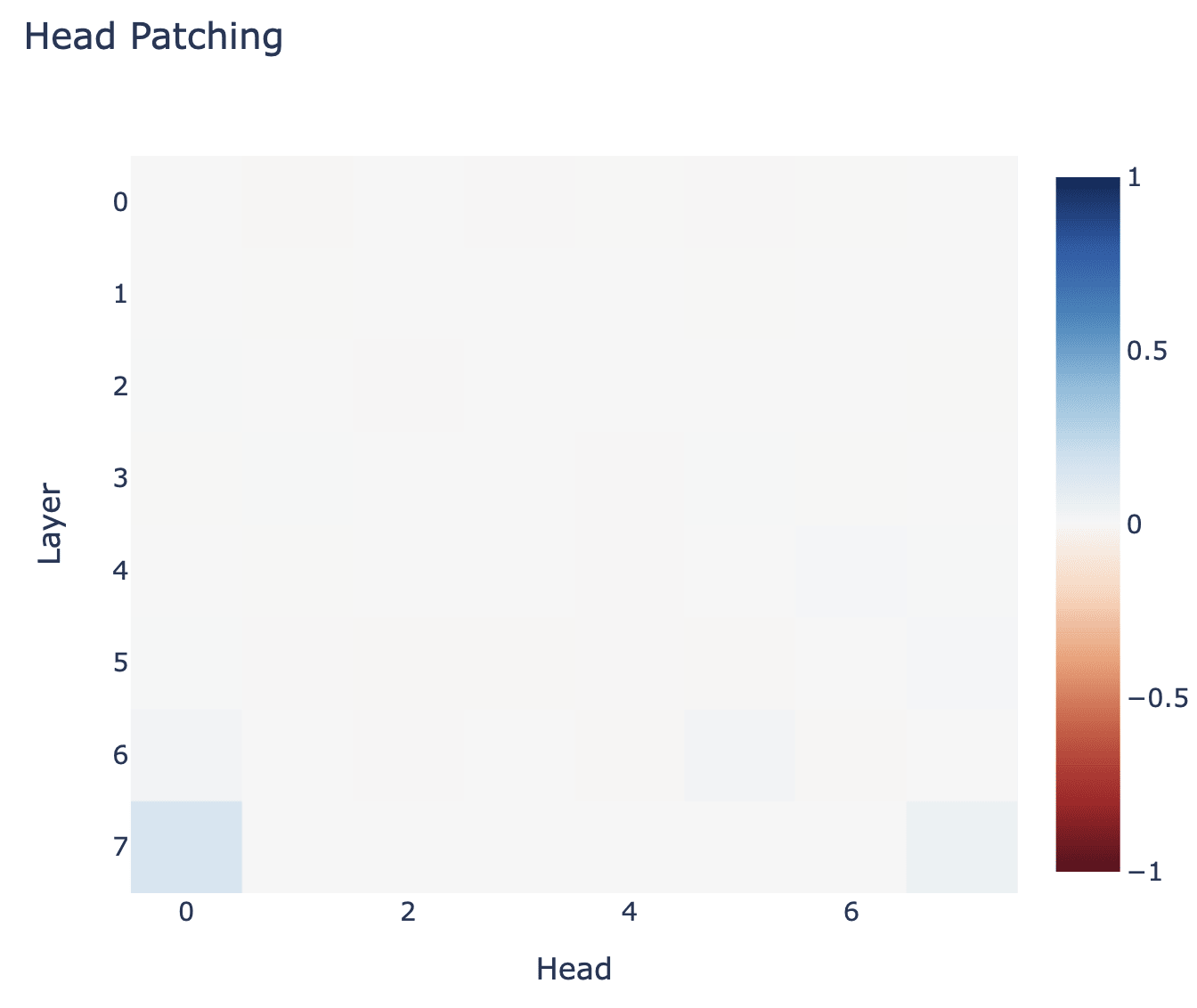 I then ran out of steam and went back to patching. I now tried to patch in individual heads and look at their effect on the C0 logit (now normalised such that 1 means "fully recovered" and 0 means "no change"). Head L7H0 was the main significant one, but I couldn't get much out of it.
