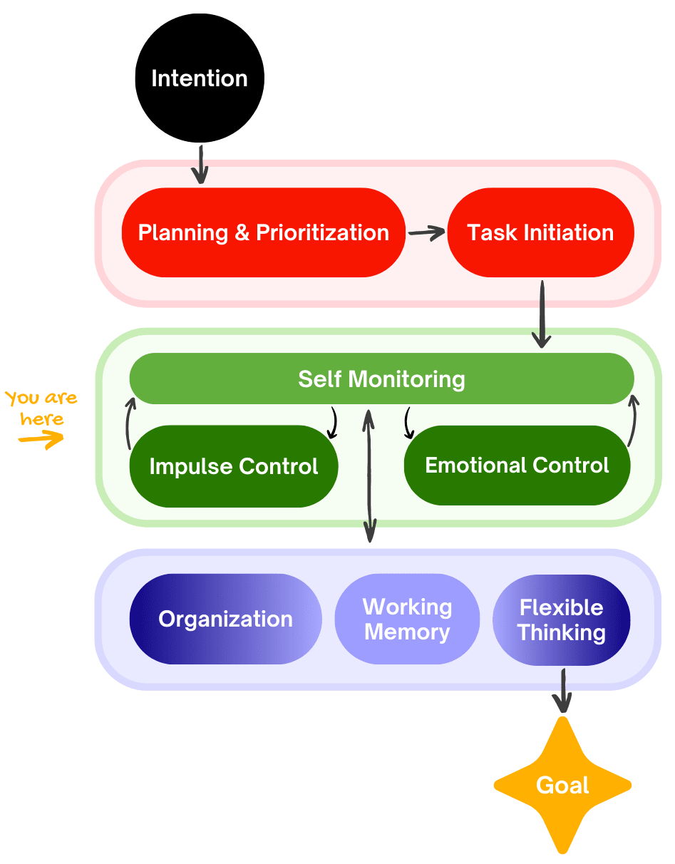 It’s worth noting that in the flowchart, Impulse Control, Self Monitoring, and Emotional Control are only vaguely sequential and are all bound together. But I’ve organized this post in what I believe is the best order to understand them before revisiting how they affect each other at the end.
