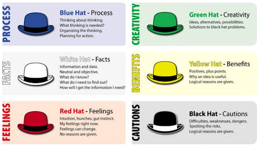 The idea is that you can think through a problem from each of these different lenses, one at a time, to ensure you’re not missing the solution by being too stuck in a particular mental frame. It's also a particularly useful tool for social coordination, where, instead of people having different hats on at different times and potentially butting heads over why they’re focusing on different aspects of a debated concept or problem or solution, everyone take turns working to make different focuses of attention common knowledge, while being more obviously part of the same team.