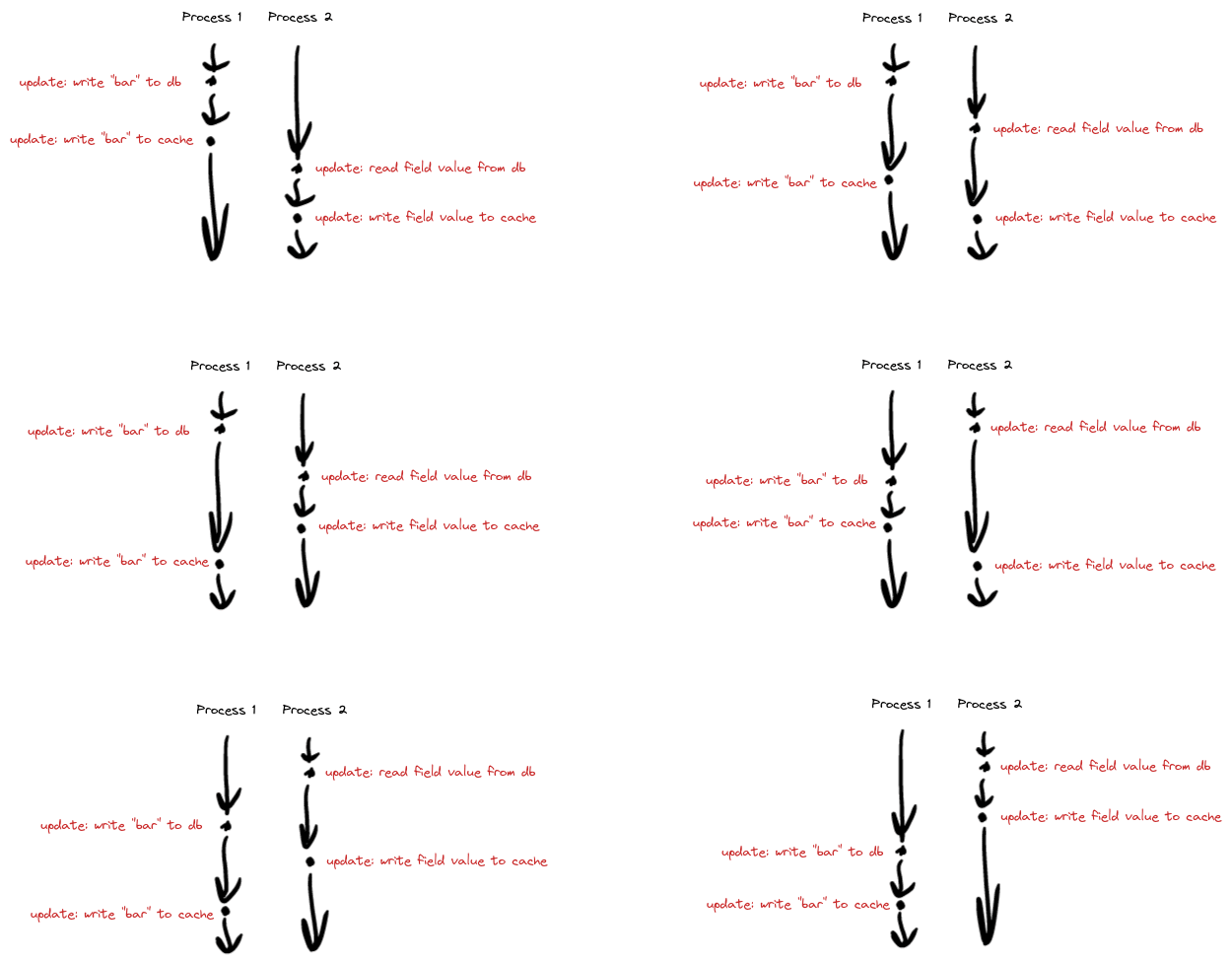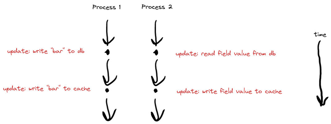 Each process has its own internal “time”: the database read/write happens first, and the cache overwrite happens second. But between processes, there is no guaranteed time-ordering. For instance, the first step of process 1 could happen before all of process 2, in between the steps of process 2, or after all of process 2.