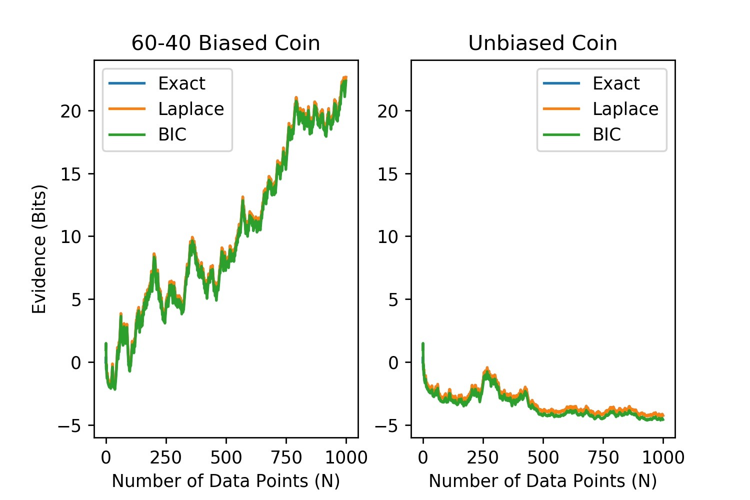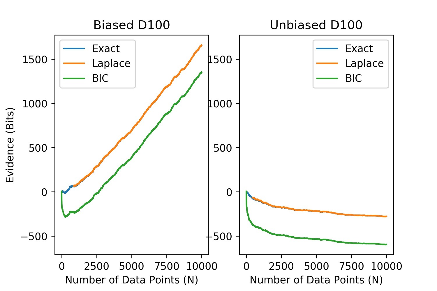 All three methods agree very well. We can't see the exact method's line at all, because it's under the Laplace line. BIC does have a visible bias - it's usually a little below exact & Laplace - but the difference is small.
