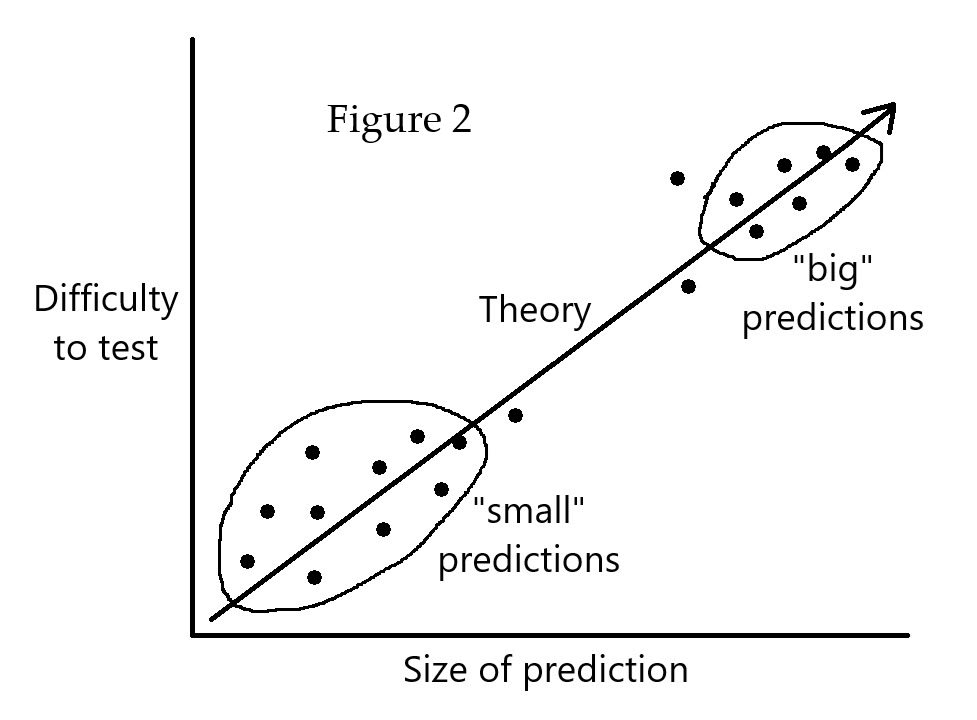 One useful way of thinking about theories is that they make “big” predictions and “small” predictions [Figure 2]. Big predictions have consequences that one cares about but may be difficult to observe directly. Small predictions are of little consequence in themselves, but can be tested more easily. If the small predictions are validated by experiment, that lends evidence to the theory being valid, which in turn makes the big predictions more plausible. Note that, even as small predictions validate a theory, the big predictions remain speculative, since they assume there are no major discontinuities in the pattern.