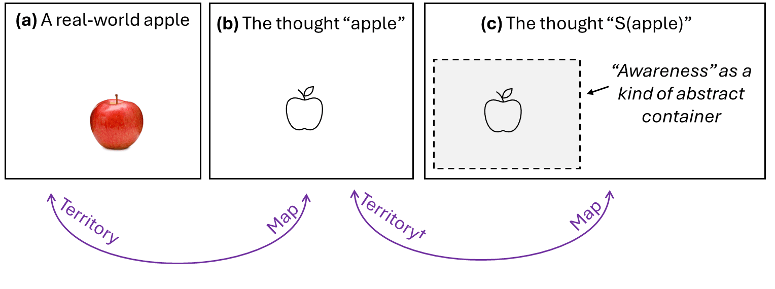 2.2.3 “S(apple)”, defined as the self-reflective thought “apple being in awareness”, is different from the object-level thought “apple”
