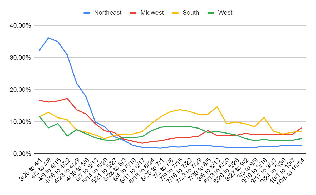 The Northeast’s push to increase testing makes it look stable here, but this chart confirms that the alarming Midwest number is real and the slide in the West is real as well. The South also seems headed in the wrong direction. The Midwest has the highest positive percentage on tests, not merely the most infections.