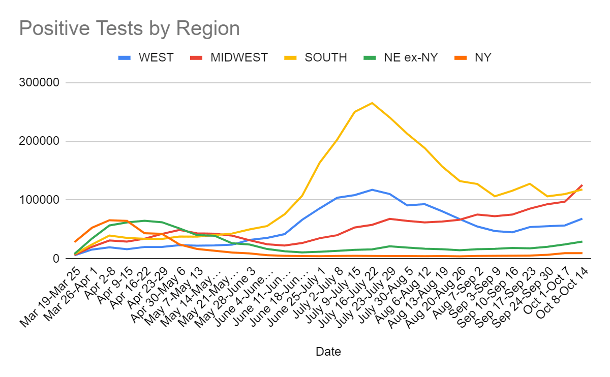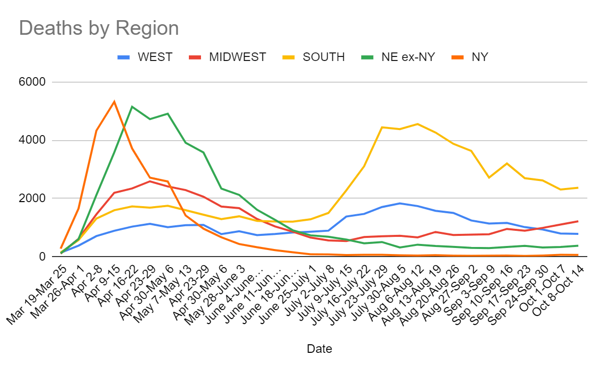 The trend in the Midwest continues and is even more clear than last week, with the same true to a lesser degree in the Northeast. The deaths are starting to show up. The West and South, meanwhile, repeated their numbers from last week, which is disappointing but neither terribly scary nor all that surprising. One can of course say that lagging indicators are still lagging, and the deaths are indeed coming Real Soon Now.