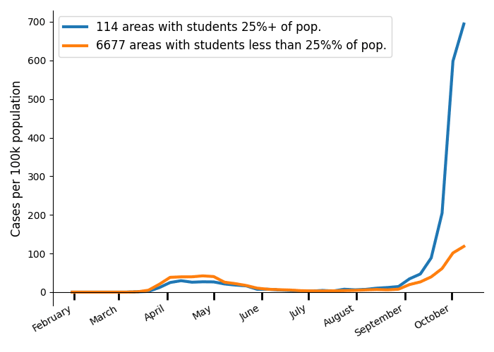 Whether or not lower schools are an important vector, it seems clear that colleges are a major vector. It’s not clear this should worry us or even necessarily be a bad thing. It’s a reasonably efficient way to get herd immunity, and hopefully predicts further declines in death rates.